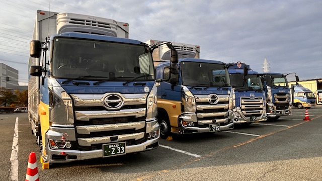 画像左から、冷凍冷蔵車2台、15トン低床平ボディ、カーボンバルク車です。
